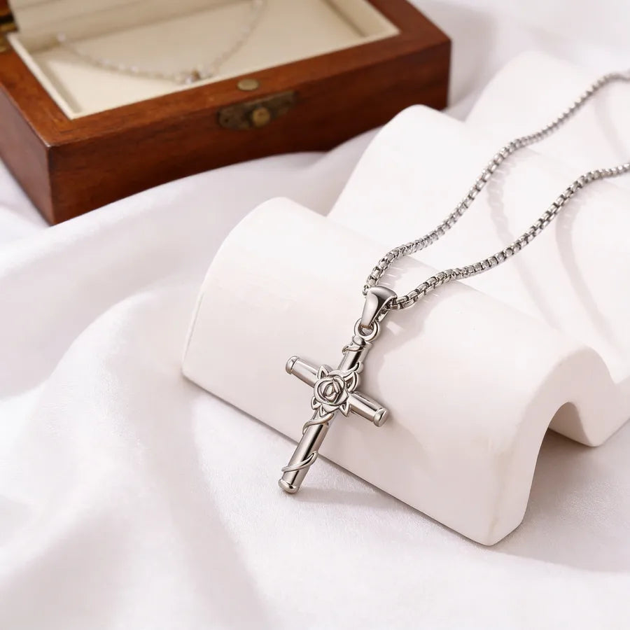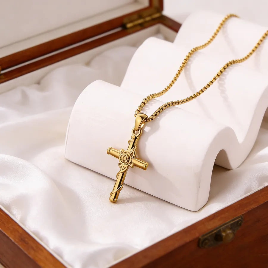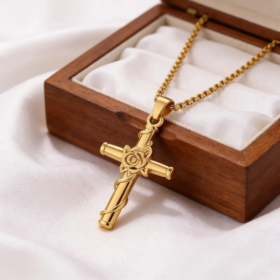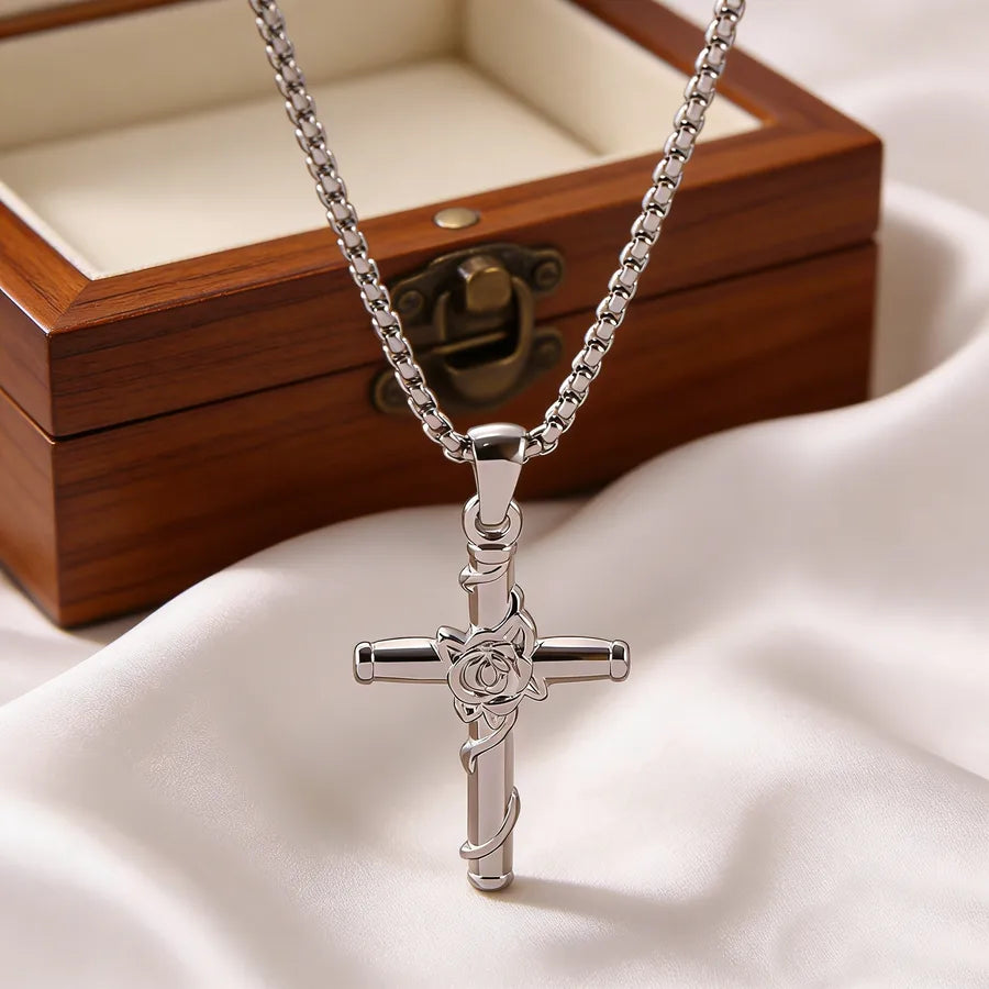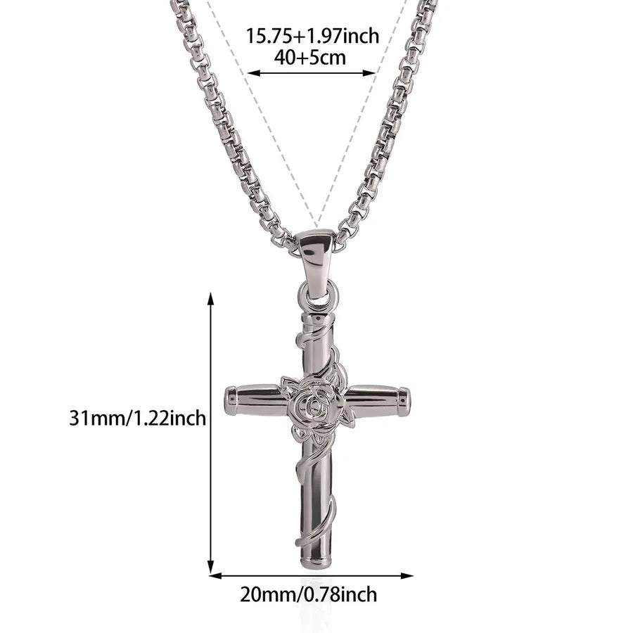 Rose Cross Necklace For Unisex Featuring 304 Stainless Steel in Steel Color